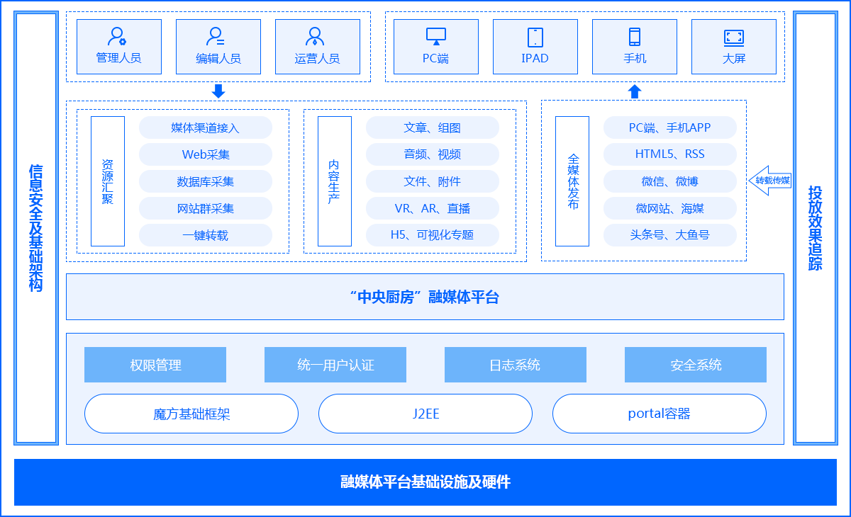 支持构建跨平台跨终端的统一内容发布平台。可将审核完成的稿件一键发布到PC端、移动APP、微信、微博、海媒(Facebook、Twitter、YouTube)、头条号等新媒体平台,支持PC、手机、IPad、电视等多终端展示,实现内容全网推送。