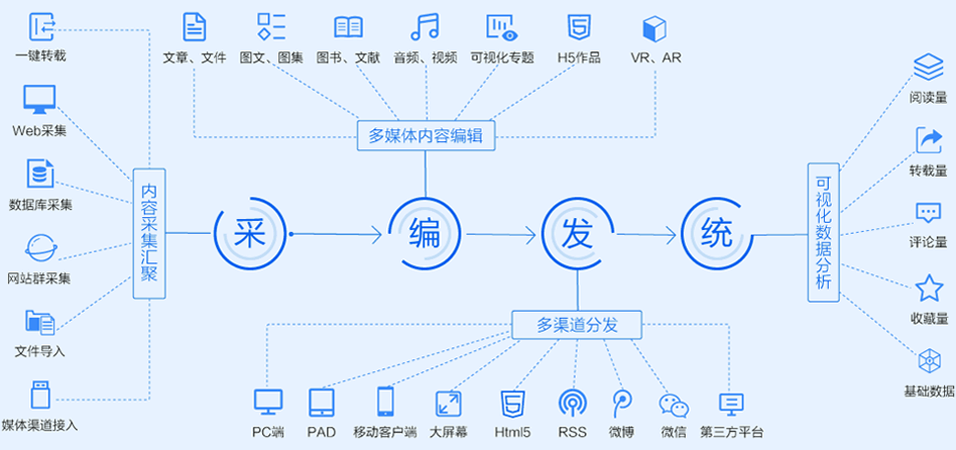 提供包括一键转载、文件导入、Web采集、数据库采集、网站群采集、媒体渠道接入等在内的多种内容采集方式,全面整合针对性创意选题收集和传统媒体约稿,为后期媒体传播提供全面完整素材。